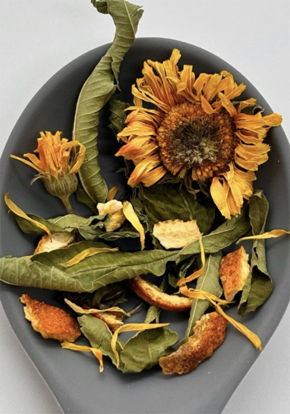 vihermintun lehdet, rautayrtin lehdet, kehäkukan kukat, appelsiininkuoren palat
